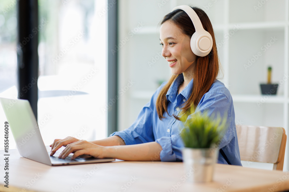 Beautiful young Asian woman college student wearing white headphones at classroom. College student working on the college campus. back to school concept