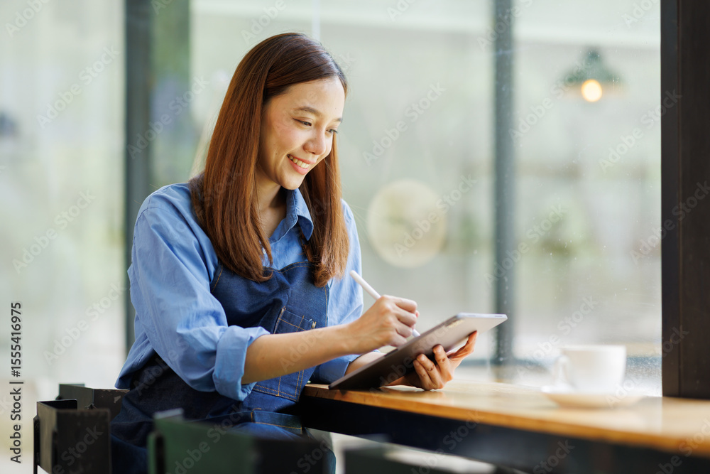 Asian woman, tablet and small business in ecommerce, fashion or logistics in remote startup at work. asian female owner working on touchscreen technology in clothing store success