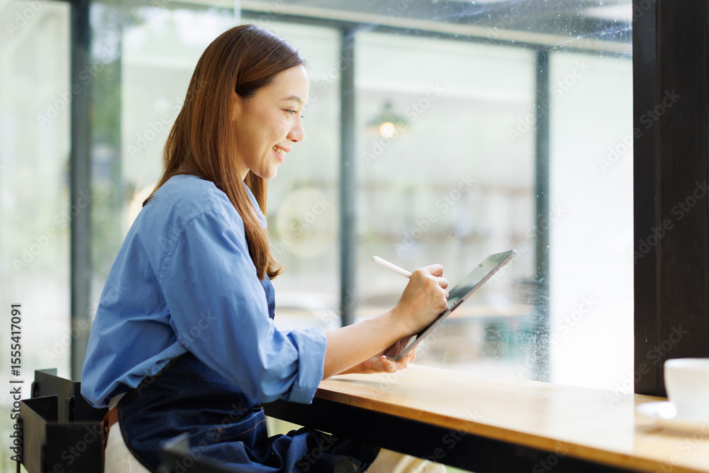 Asian woman, tablet and small business in ecommerce, fashion or logistics in remote startup at work. asian female owner working on touchscreen technology in clothing store success