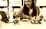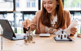 Hand plans home refinance. Pressing calculators, House model, buy or rent, calculators on desk. Saving for property purchase, optimal mortgage payment. Tax, credit analysis for financial planning.