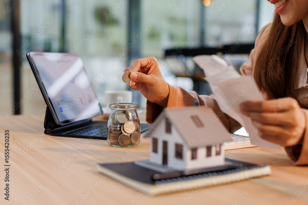 Hand plans home refinance. Pressing calculators, House model, buy or rent, calculators on desk. Saving for property purchase, optimal mortgage payment. Tax, credit analysis for financial planning.