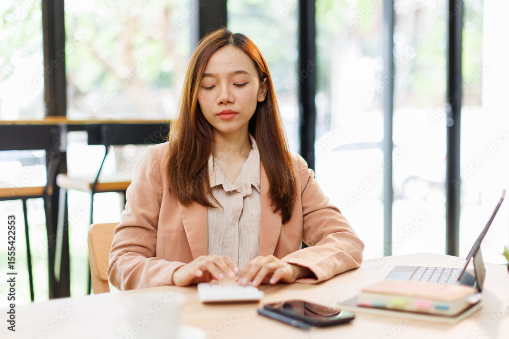 asian young woman hand checking list with bill for calculate accounting expense credit card payment on due deadline, trying to find money to pay debt on table. Business financial concept,
