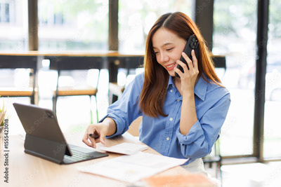 Smiling asian woman writing notes while making phone call and using laptop at workplace.
