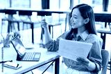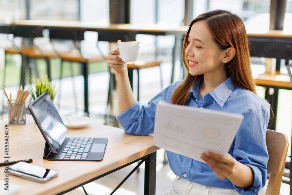 Asian female successful employee business freelance is holding document to reading business data and financial chart while working with laptop in the workplace office.