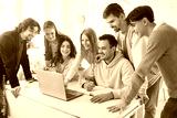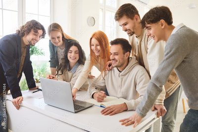 Young people discussing job project or new startup with brainstorming standing on workplace in office. Company employees or college students working with laptop. Teamwork and education concept.