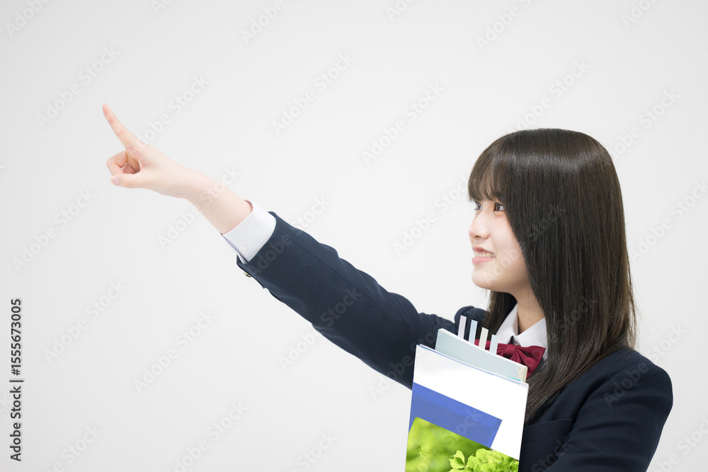塾や予備校などの大学受験イメージ教科書を持つ女子高生の横顔目指す合格! オススメ指差しポーズ