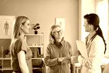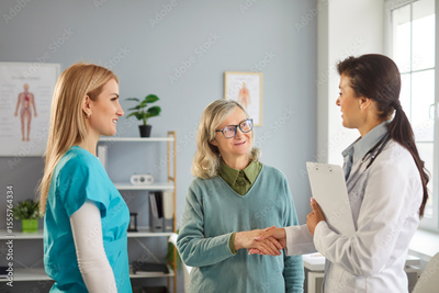 Cheerful doctor and nurse shaking hands with an elderly female patient during a medical visit at a hospital or clinic. Care, professionalism, and the importance of healthcare services.