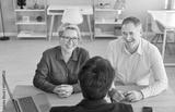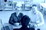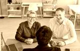 Smiling happy elderly couple talking with man advisor about health insurance or investments sitting at the desk in office with laptop. Senior man and woman talking with male financial agent.