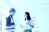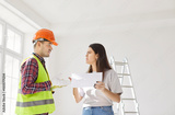 Foreman worker and serious female client asking, directs worker on meeting looking at project plan, holding blueprints, planning work, discussion with construction engineer in hardhat, architect talk