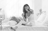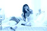 Portrait of a young upset woman suffering from headache disease sitting on bed in bedroom at home holding glass of water. Sick female person feeling stressed or migraine in the morning.