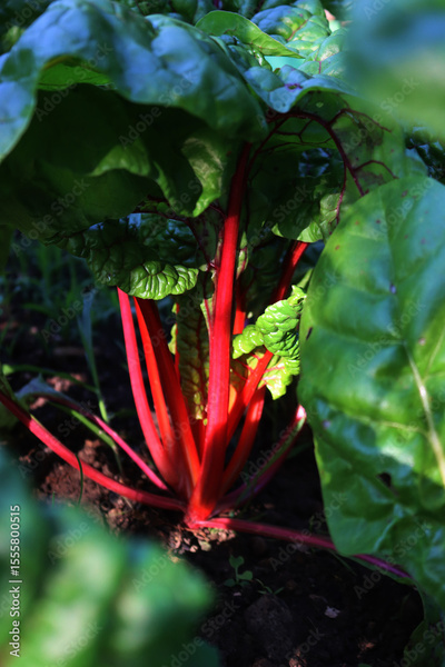 Red Swiss chard plants growing in the vegetable garden on summer. Beta vulgaris