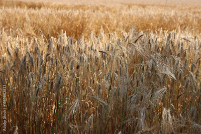Close-up of golden wheat field ready to harvest on summer.Triticum agricultural field in the italian countryside