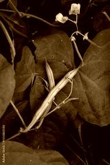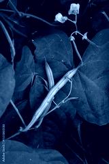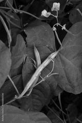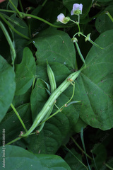 Close-up of Green bean plants with small white blossoms. French bean plant in bloom in the vegetable garden