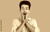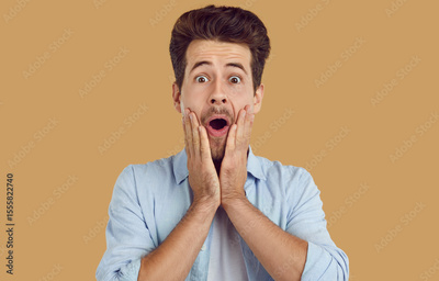 Portrait of young amazed scared man in blue shirt on beige background looking at camera. He touching his surprised face two hands on chin. Wide-open eyes and mouth in horror. Human sincere emotion.