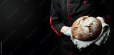 Female hands hold Fresh Sourdough Bread on black background. Top view.