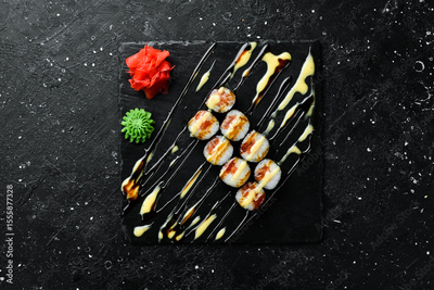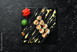 Classic sushi rolls with fish. Japanese food. On a black stone background. Top view.