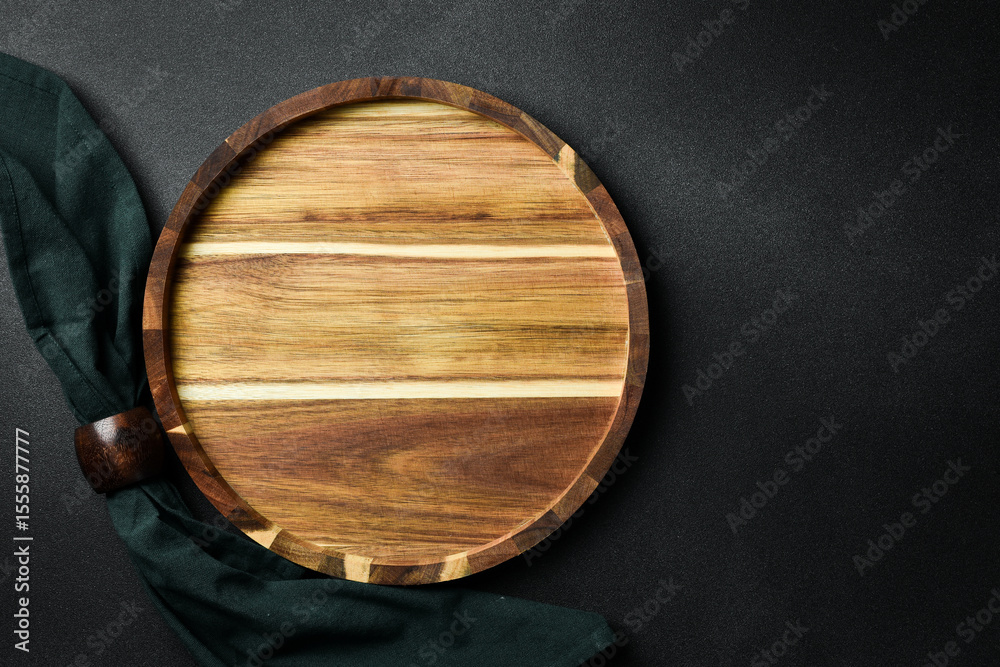 Kitchen wooden tray or board on a dark stone background. Top view. Free space for text.