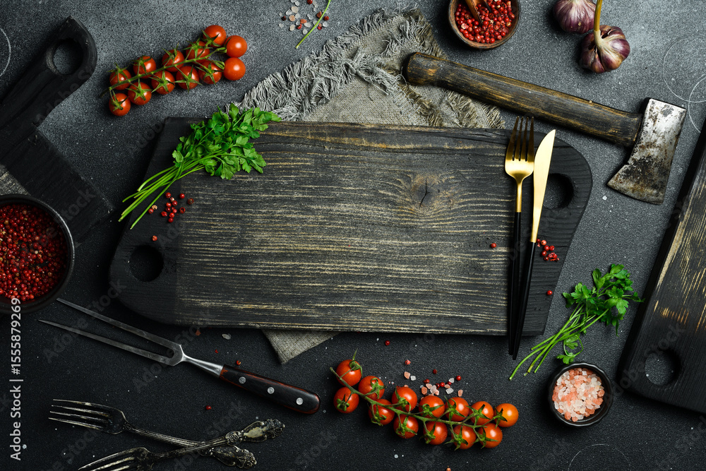 Black stone cooking background. Spices and vegetables. Top view. Free space for your text.
