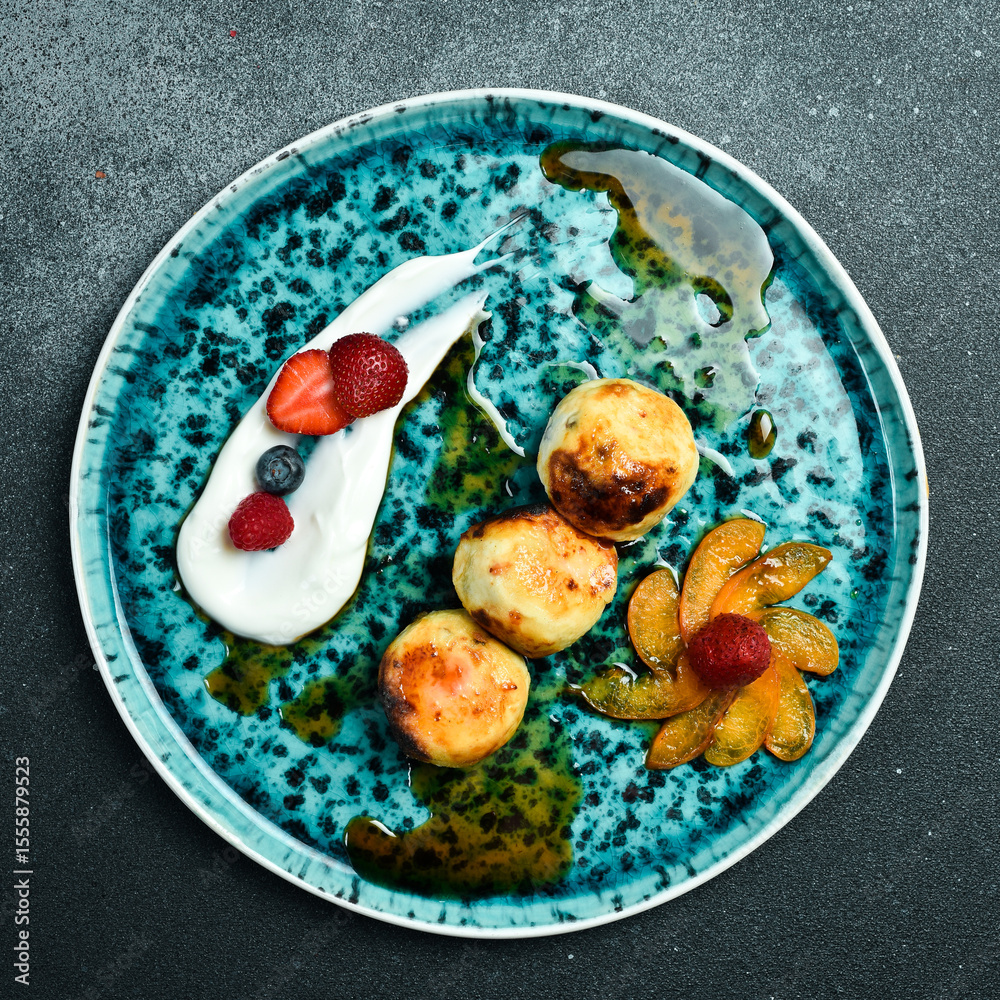 Cheese pancakes with strawberries and sour cream. On a plate. Breakfast.