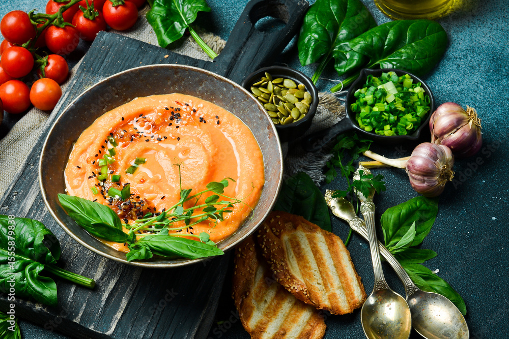Vegan Carrot cream soup with basil and cream. In a bowl. The concept of vegetarian food.
