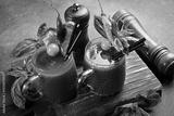 Fresh tomato juice with spices and basil in a cup. On a dark stone table.