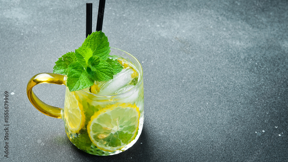 Refreshing summer alcoholic cocktail mojito with ice, lemon and mint. On a dark stone table.