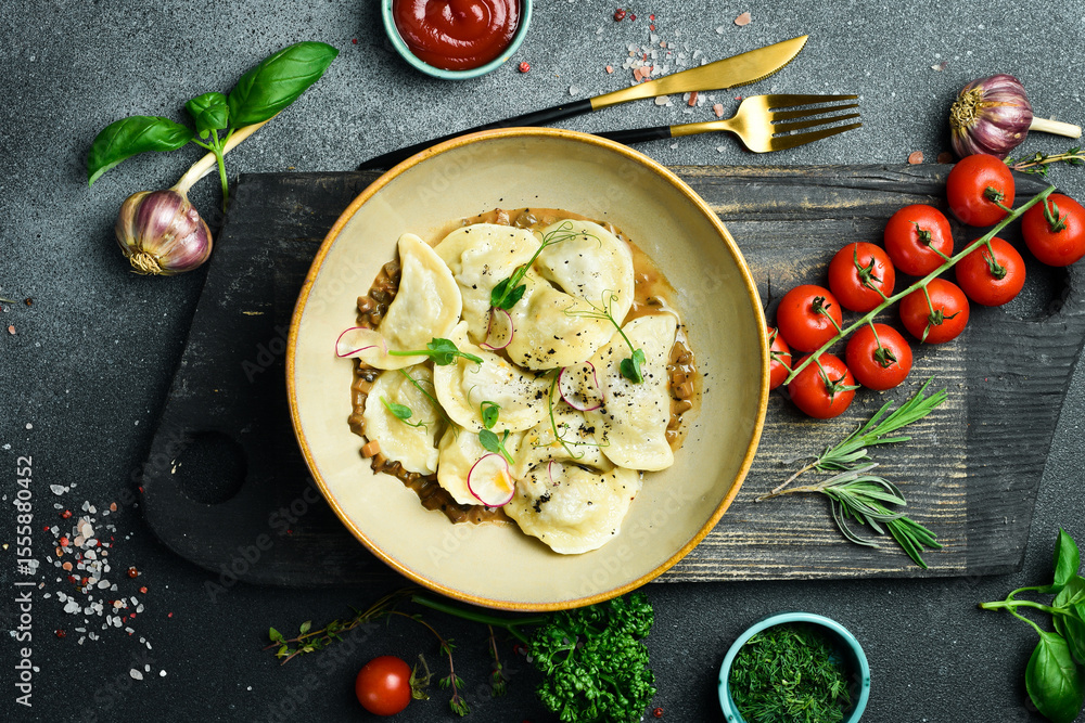 Dumplings with potatoes and mushroom sauce. On a black stone background. In a plate, close-up.