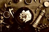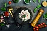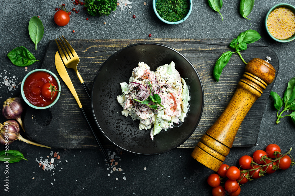 Salad of cabbage, tomatoes, onions and radish dressed with sour cream. On a plate. Restaurant serving. Close up. On a dark stone background.