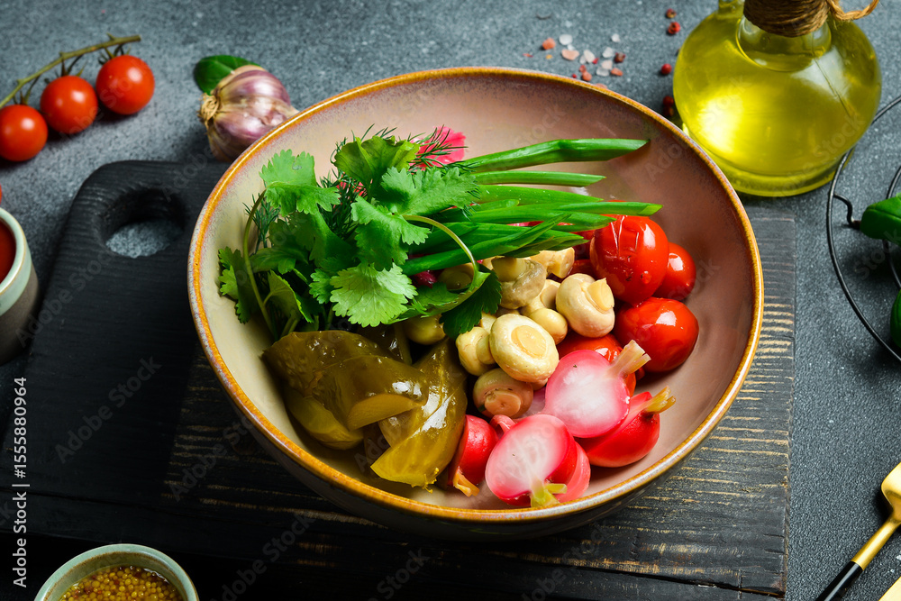 Pickled vegetables: cabbage, cucumber, tomato. Close up. on a plate On a black stone background.
