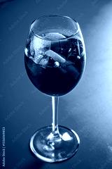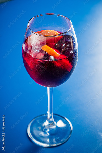 A stunning cocktail filled with colorful fruit garnishes sits elegantly on a bright blue surface