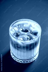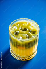 A refreshing cocktail in a textured glass rests on a vibrant blue backdrop, inviting relaxation