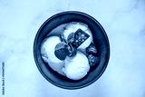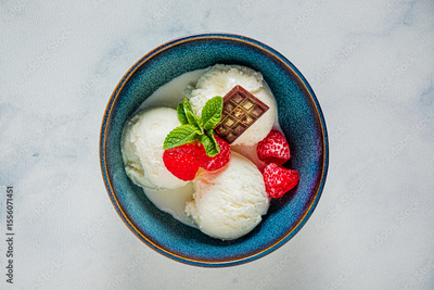 Creamy vanilla ice cream scoops topped with strawberries and a chocolate piece