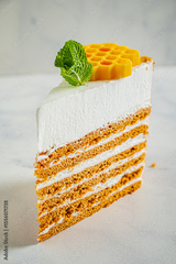 Layers of soft sponge and creamy frosting are beautifully presented, topped with honeycomb and mint