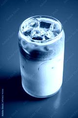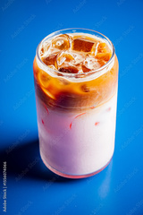 Creamy iced coffee meets milk with a refreshing sensation against a bold blue background