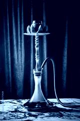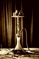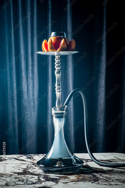 A delicate hookah rests on a marble table, adorned with fresh fruit and swirling smoke
