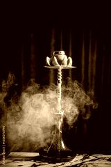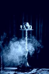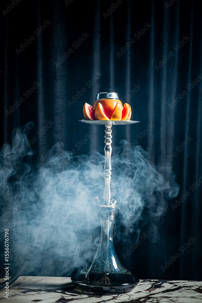 A vibrant hookah with fruity toppings fills the cozy space with fragrant smoke