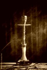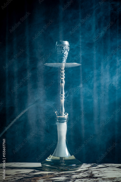 An intricate hookah stands on a table, surrounded by billowing smoke, emitting a mystical vibe