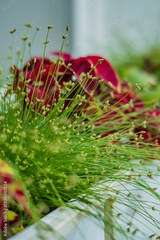 Lush greenery intermingles with colorful flowers, creating a vibrant garden display in bloom