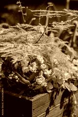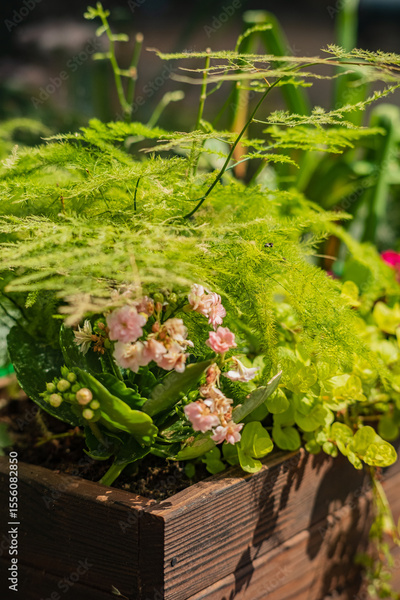 Vibrant flowers and lush ferns intertwine beautifully in a rustic wooden planter under the sun