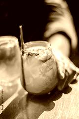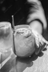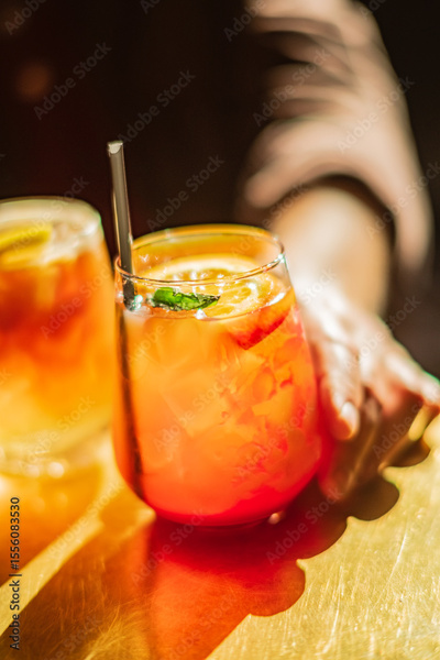 Vibrant drinks with citrus and mint rest on a warm wood surface, inviting enjoyment