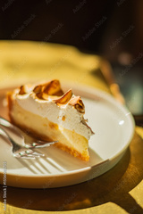 A luscious lemon meringue pie slice sits on a plate, basking in the warm sunlight, awaiting a bite
