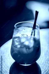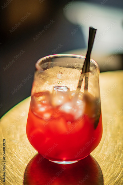 Refreshing drink filled with ice and vibrant colors catches the glow of ambient light in a cozy bar