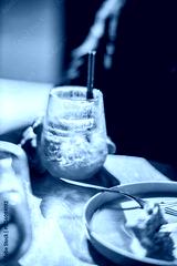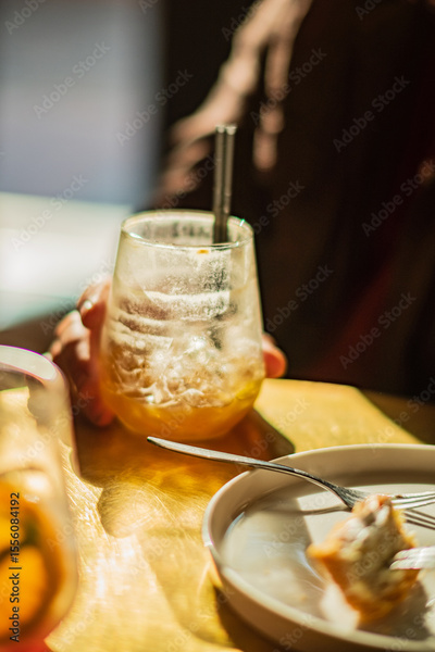 A hand holds a chilled drink beside a plate of dessert, illuminated by warm sunlight