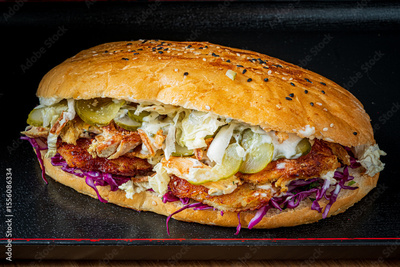 Crispy fried chicken in a soft bun, topped with crunchy pickles and fresh greens