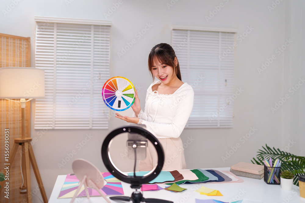 Personal Color Analysis Coaching Online Asian Woman Presenting Color Wheel for Fashion Style Seasonal Colors Makeup Hair and Wardrobe in Digital Studio