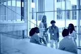 Happy diverse student doctors communicating in hallway at medical university.
