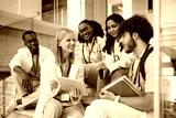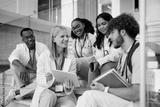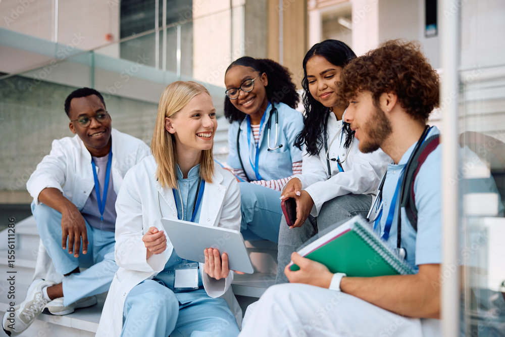 Happy medical student and her colleagues using touchpad while relaxing at university.