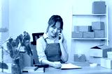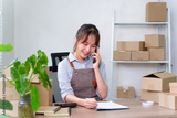 Young Asian Women Talking on Phone Taking Notes at Desk with Shipping Boxes Home Office Business Online Shop eCommerce Parcel Courier Stock Photo