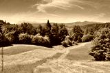 Idyllic landscape in the Beskid Sadecki,Poland, with fresh green meadows and green forests mountain tops in the background.