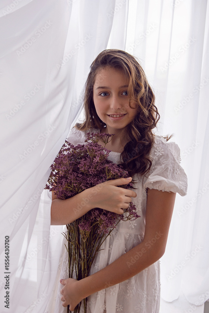 Portrait of a beautiful teenage girl in a white dress holding flowers and standing against the background of a window.